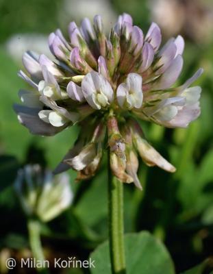 短期多年生草本,生长期达5年,高10~30cm。主根短,侧根和须根发达。茎匍匐蔓生,上部稍上升,节上生根,全株无毛。叶柄较长,长10~30cm;托叶卵状披针形,膜质,基部抱茎成鞘状,离生部分锐尖;掌状三出复叶;小叶倒卵形至近圆形,长8~20mm,宽8~16mm,先端凹头至钝圆,基部楔形渐窄至小叶柄,中脉在下面隆起,侧脉约13对,与中脉作50°角展开,两面均隆起,近叶边分叉并伸达锯齿齿尖;小叶柄长1.5mm,微被柔毛。花序球形,顶生,直径15~40mm;总花梗甚长,比叶柄长近1倍,具花20~50朵,密集;无总苞;苞片披针形,膜质,锥尖;花长7~12mm;花梗比花萼稍长或等长,开花立即下垂;萼钟形,具脉纹10条,萼齿5,披针形,稍不等长,短于萼筒,萼喉开张,无毛;花冠白色、乳黄色或淡红色,具香气,旗瓣椭圆形,比翼瓣和龙骨瓣长近1倍,龙骨瓣比翼瓣稍短;子房线状长圆形,花柱比子房略长,胚珠3~4粒。荚果长圆形,种子通常3粒。种子阔卵形。花果期5~10月。