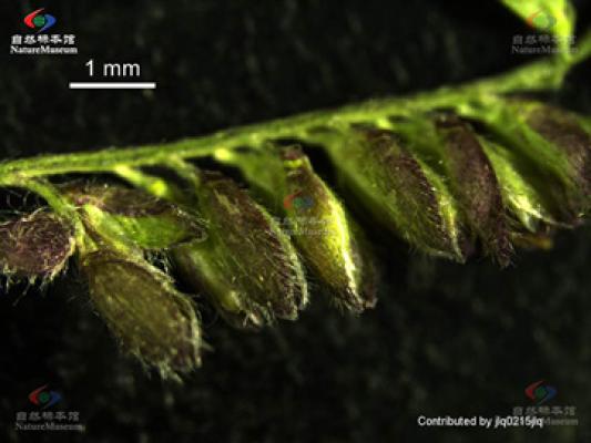 一年生草本。秆较纤细,基部常外倾,节上生根,上部直伸,多分枝,高10~60cm,节上密生白色柔毛。叶鞘疏生瘤基柔毛或近无毛,边缘有纤毛;叶舌极短,仅为一圈白色纤毛;叶片线形或线状披针形,扁平,长2~10cm,宽2~6mm。圆锥花序由3~12个沿主轴互生的总状花序组成,主轴长2~7cm;总状花序长0.5~2.5cm,单一或花序下部有时再二次分出小枝;小穗单生,覆瓦状偏生于穗轴的一侧,椭圆形,长1.7~2.7mm;第一颖短小,长0.2~0.5mm,约为小穗的1/6,膜质,无脉,先端微凹入;第二颖与小穗等长,具5脉;第一外稃与第二颖同形,骨质,表面平滑而有光泽,容易脱落,先端钝圆,长约1.5mm,边缘内卷,包卷同质内稃。