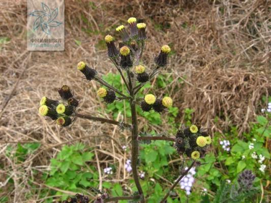 一年生草本,高40~100cm。不分枝或上部多分枝,具条纹,被疏柔毛。叶无柄,具翅,基部渐狭或半抱茎,披针形至长圆形,顶端急尖或短渐尖,边缘具不规则的粗齿,羽状脉,两面无毛或下面沿脉被短柔毛。头状花序较多数,在茎端排列成伞房状。总苞筒状,淡黄色至褐绿色,基部有数枚线形小苞片;总苞片1层,线形或线状披针形,顶端尖或稍钝,边缘窄膜质,外面无毛或被疏生短刚毛。小花多数,全部管状,淡绿色或带红色;外围小花1~2层,雌性,花冠丝状,顶端4~5齿裂;中央小花两性,花冠细管状,顶端5齿裂。瘦果圆柱形,具明显的肋。冠毛白色。花果期6~10月。